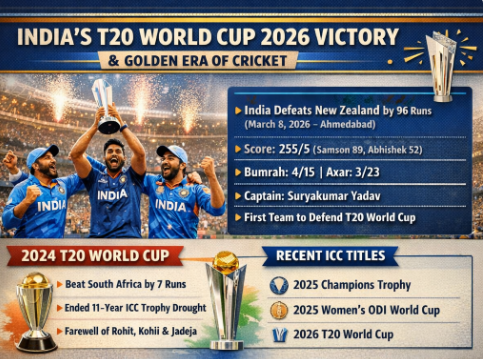 India produced a dominant performance to win the T20 World Cup 2026, defeating New Zealand by 96 runs in the final at the Narendra Modi Stadium in Ahmedabad on March 8. The victory makes India the first team in cricket history to successfully defend a T20 World Cup title and the first to win the tournament on home soil.