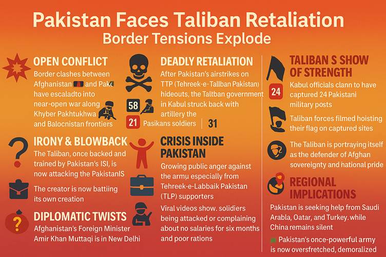 In a dramatic escalation along the Afghanistan–Pakistan border, what began as sporadic cross-border shelling has now turned into a near state of open warfare. Artillery exchanges have been reported from Khyber Pakhtunkhwa to Balochistan, with both sides claiming heavy casualties. The crisis has left Islamabad confronting an unprecedented irony — the Taliban, once fostered by Pakistan’s own intelligence establishment, is now fighting against it.