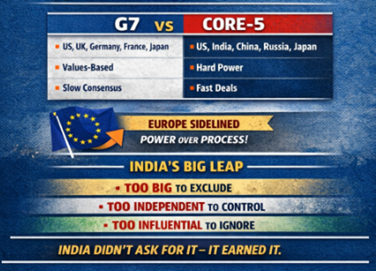 India’s inclusion in the Trump Core-5 plan marks a decisive shift in global power recognition. Unlike the G7—dominated by Western economies—the Core-5 reflects: